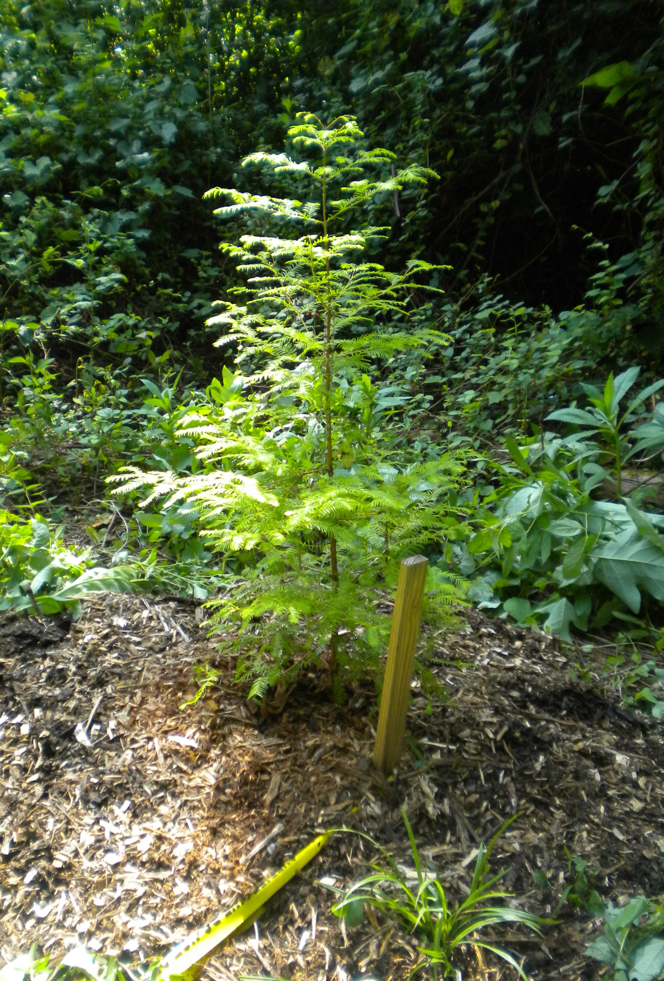 This tree is a dawn redwood, or Metasequoia glyptostroboides, an ancient species once thought extinct but has been propagated from a residual stand found in China in 1948. If it thrives, it will be a giant, dwarfing the surrounding oaks and pines. Forty years from now, the rosary that hangs on its branches will likely be gone, but if there’s good rain, it could be over fifty feet tall with a trunk over eight feet wide, eventually reaching over a hundred feet tall.