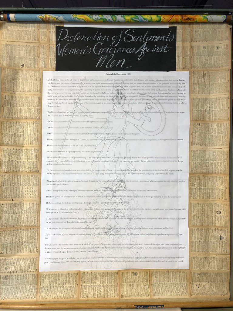 March 6, 2020 by karahammond 1 Comment Birth of Athena, Seneca Falls On the back wall of the studio, a scroll with the Declaration of Sentiments from the Seneca Falls Convention of 1848. Share this: Click to share on X (Opens in new window) X Click to share on Facebook (Opens in new window) Facebook Like Loading...