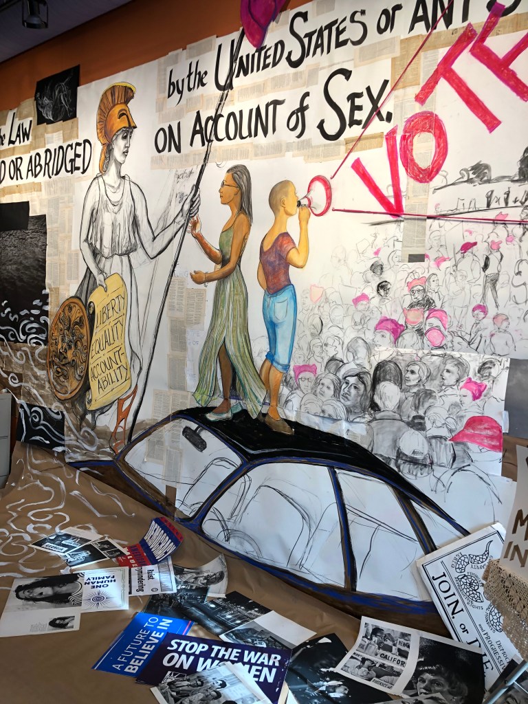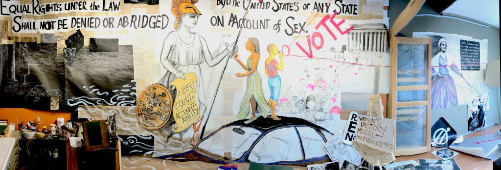 For the past several weeks, in February and March of 2020, I had been working on a large scale panoramic drawing of “Athena Entrusting the Phrygian Cap to the Next Generation”. This was to be in honor of Women’s History Month. I expect it will stay up for several months in its current form, as the studio is practicing “social distancing” until the pandemic subsides. With any luck, I’ll get to work on it some more before too long.