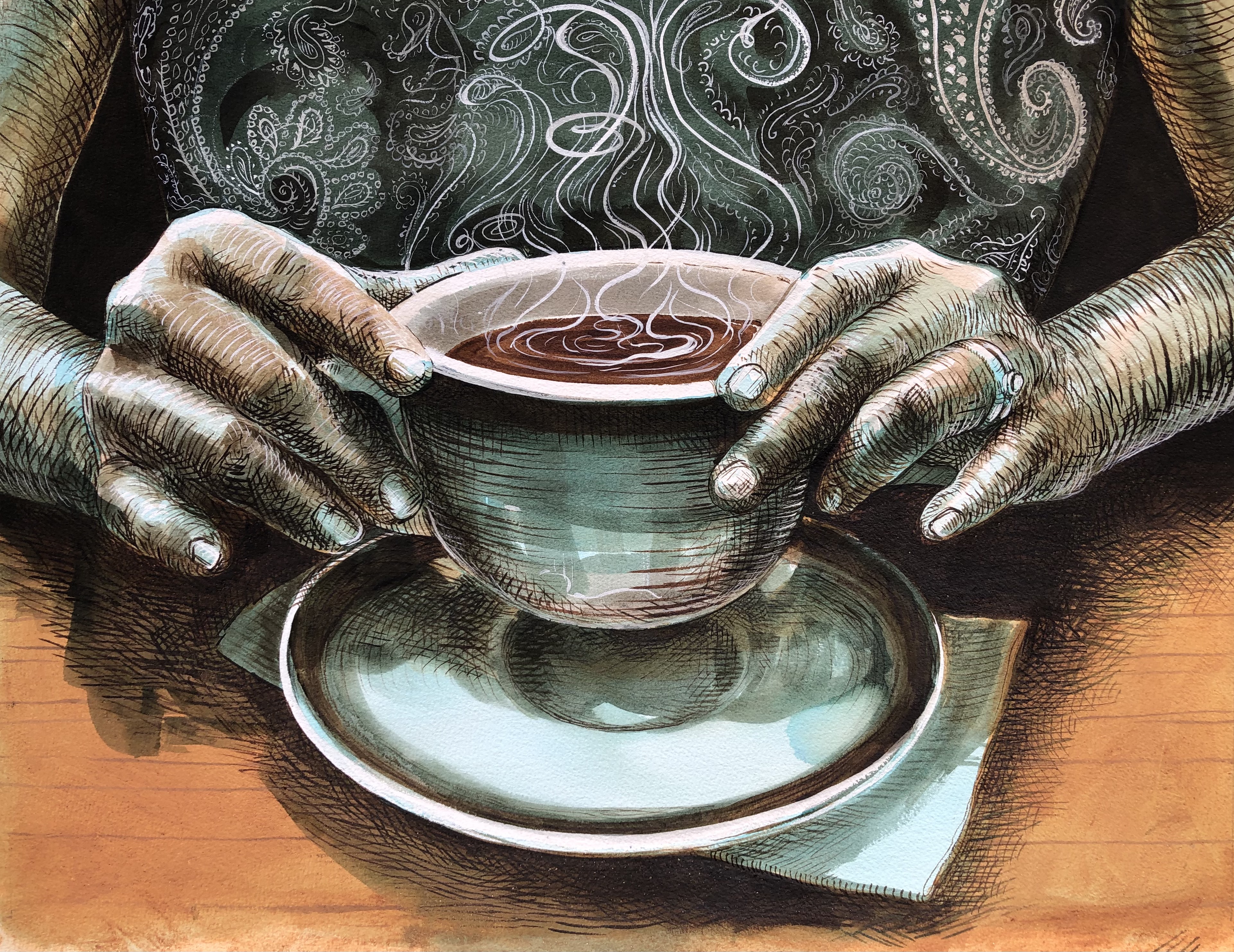 A cup of tea, a way of centering to regroup one’s thoughts, honoring contemplation in the creative process; a process of discovery in which each successive change leads down an unseen path until the endgame is clear. Every drawing is a new adventure.