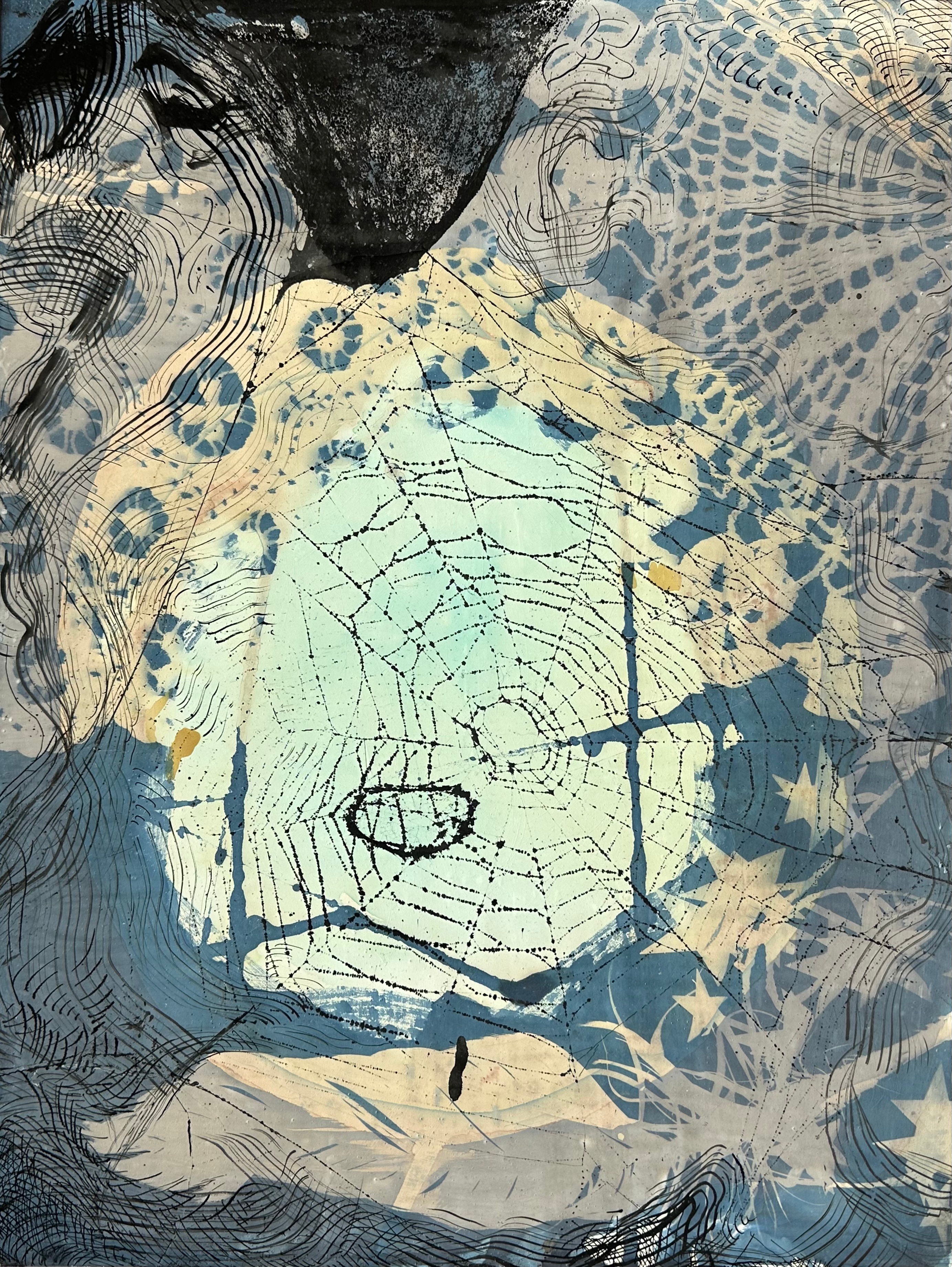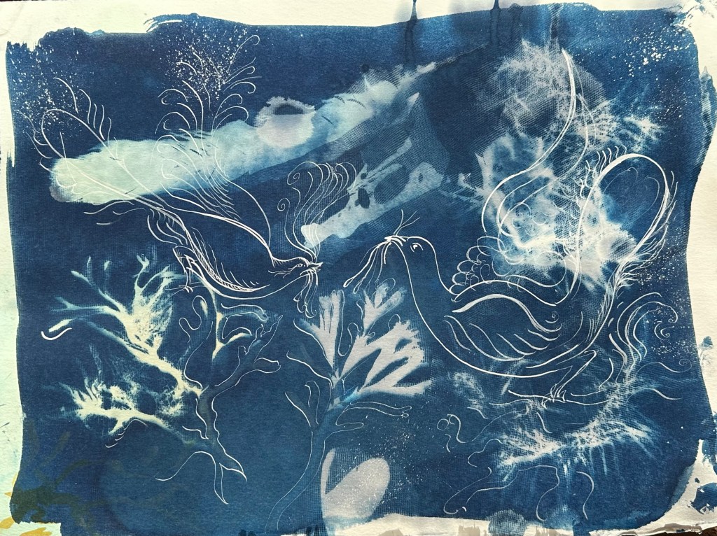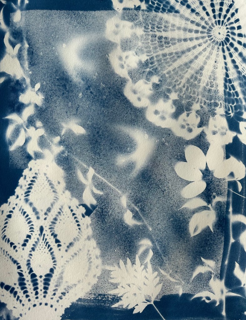 Cyanotype on watercolor paper with white ink. 11″ x 15″