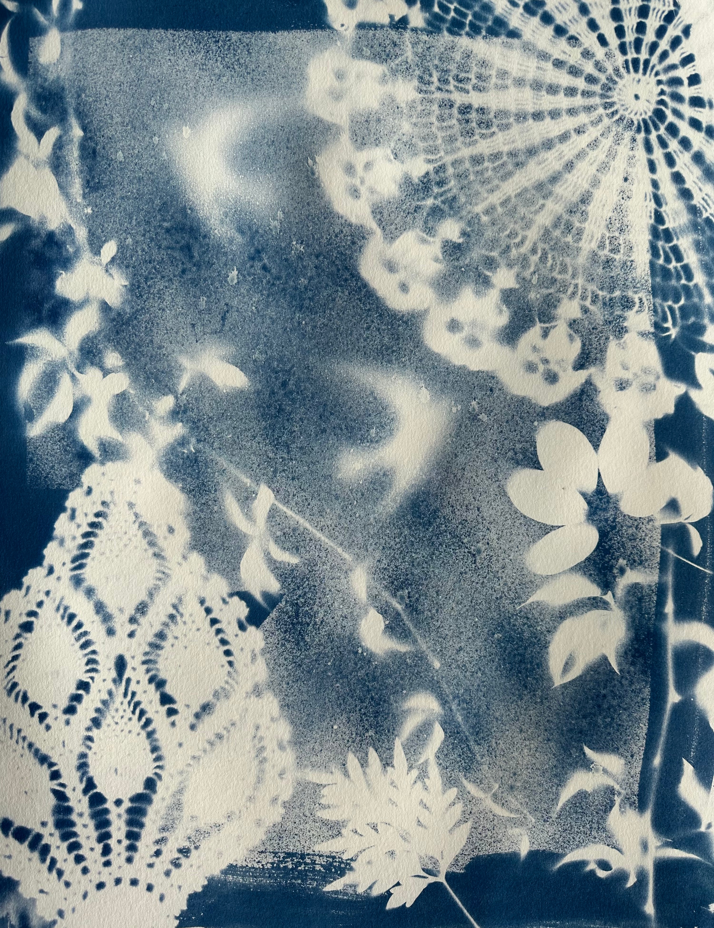 Combining natural materials with silhouetted forms and layering them with handmade inks, creating a sort of light collage. Playing here with the crochet handiwork of vintage doilies and found objects overlaying inked garden webs. The grounds I am working with on these are either natural paper or true gesso on wood panel. I am enjoying the painterliness of this early photographic process, keeping the incidental spray and drips. From there they take on the layering of collage but with a continuous surface of a photograph or drawing.