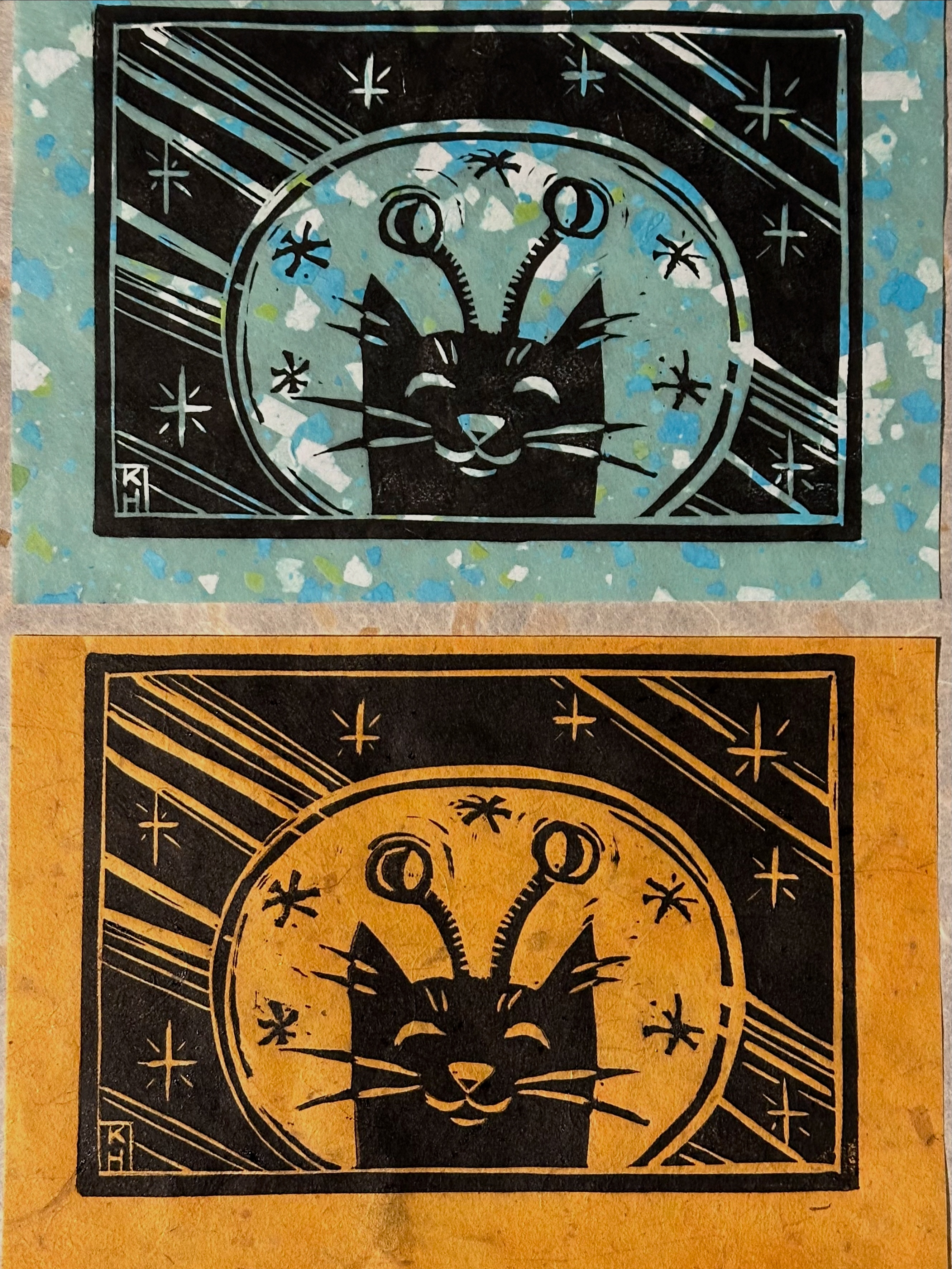 Life-size cyanotypes! Cyanotype drawings on paper, and true gesso board; linocut prints, poster designs, handmade ink drawings. Lots of new work to choose from!
