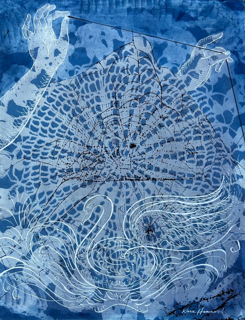 “Arachne’s Bold Move”, cyanotype and ink on true gesso board with captured spider web.