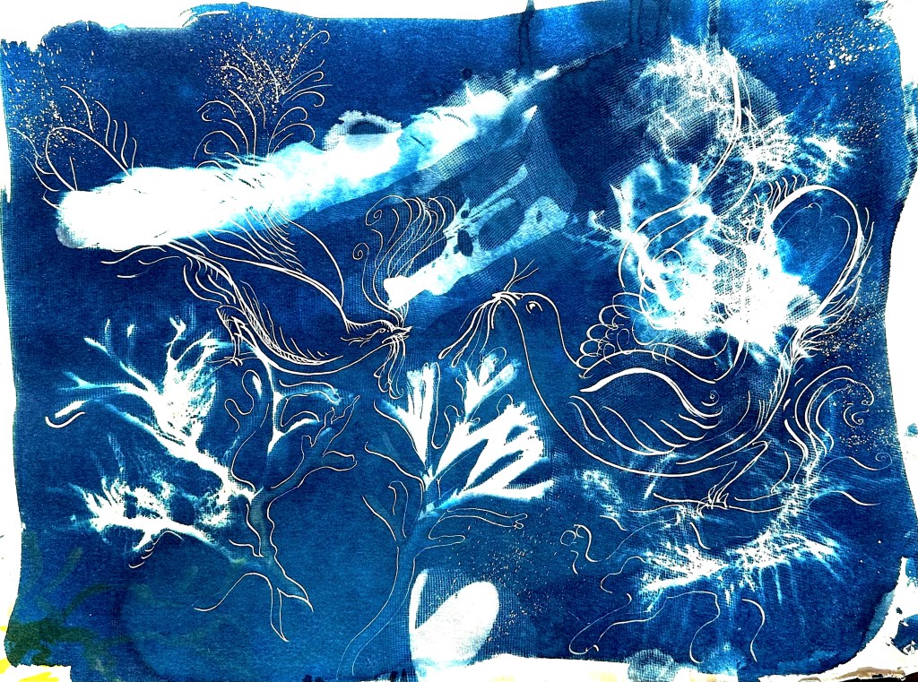 “Birds and Seaweed”, cyanotype and ink on paper.
