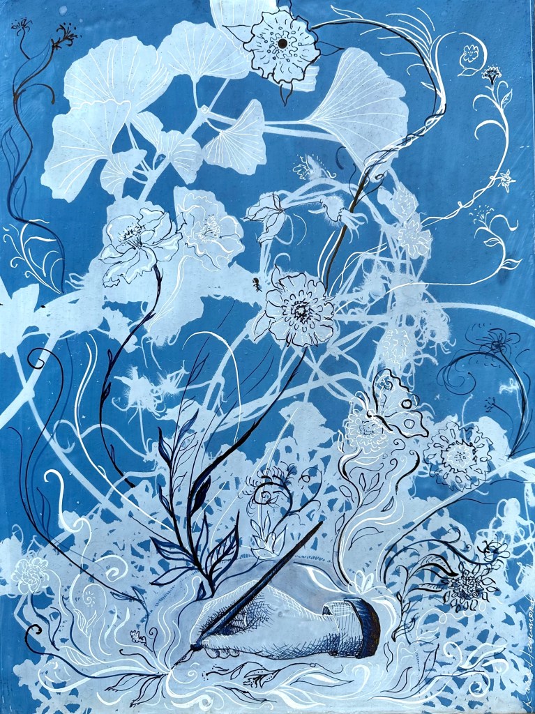 “The Flourishing”, cyanotype and ink on true gesso board.