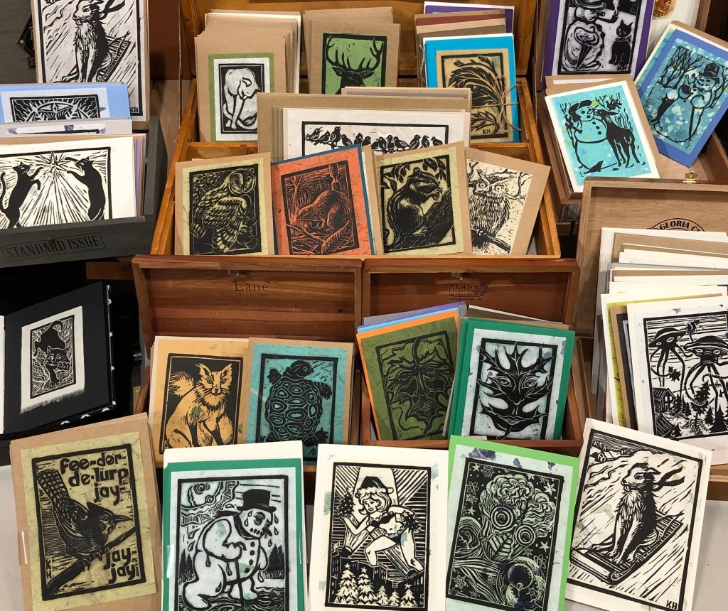 Beginning December 14, 2022, Kara Hammond Open Studio will be keeping regular hours on Wednesdays and Fridays, from 11am til 5 pm. Check out the new window design, and stop in to see this season’s most recent artist-made books of lino-cut images and prints, along with drawings, watercolors, holiday cards, and conversation.
