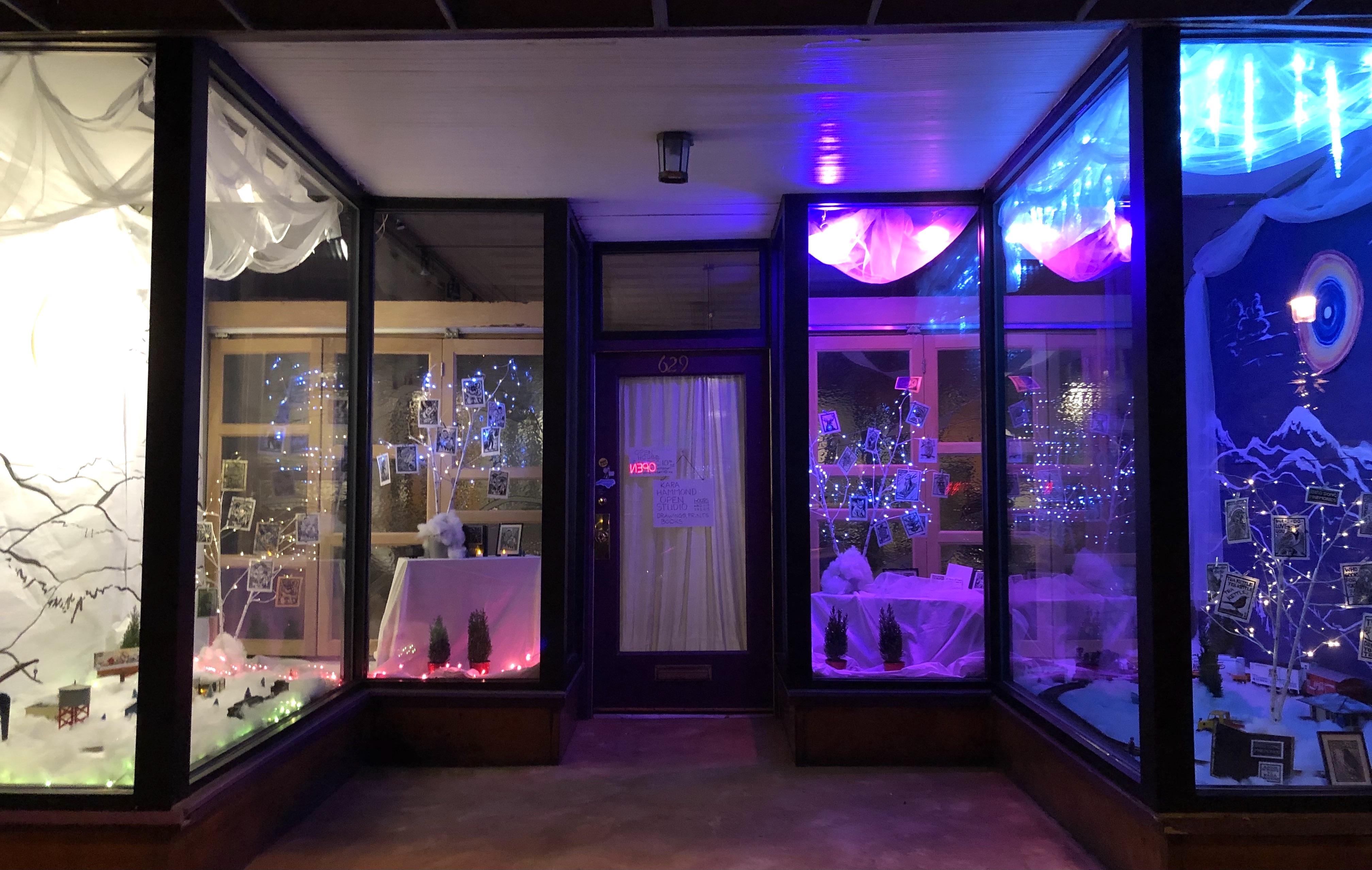 Beginning December 14, 2022, Kara Hammond Open Studio will be keeping regular hours on Wednesdays and Fridays, from 11am til 5 pm. Check out the new window design, and stop in to see this season’s most recent artist-made books of lino-cut images and prints, along with drawings, watercolors, holiday cards, and conversation.
