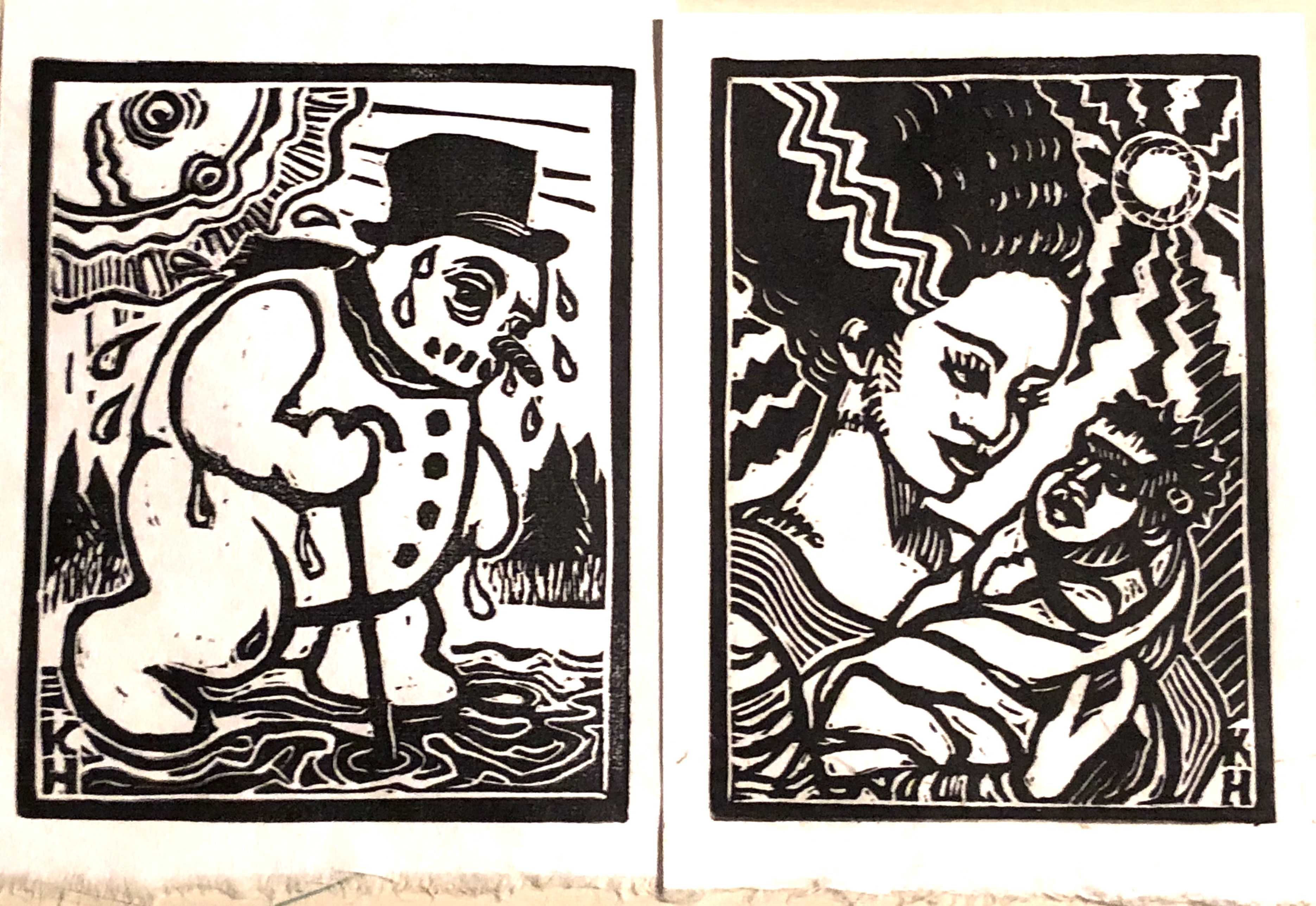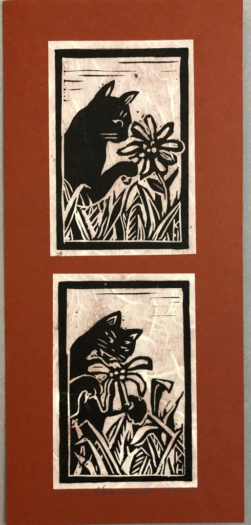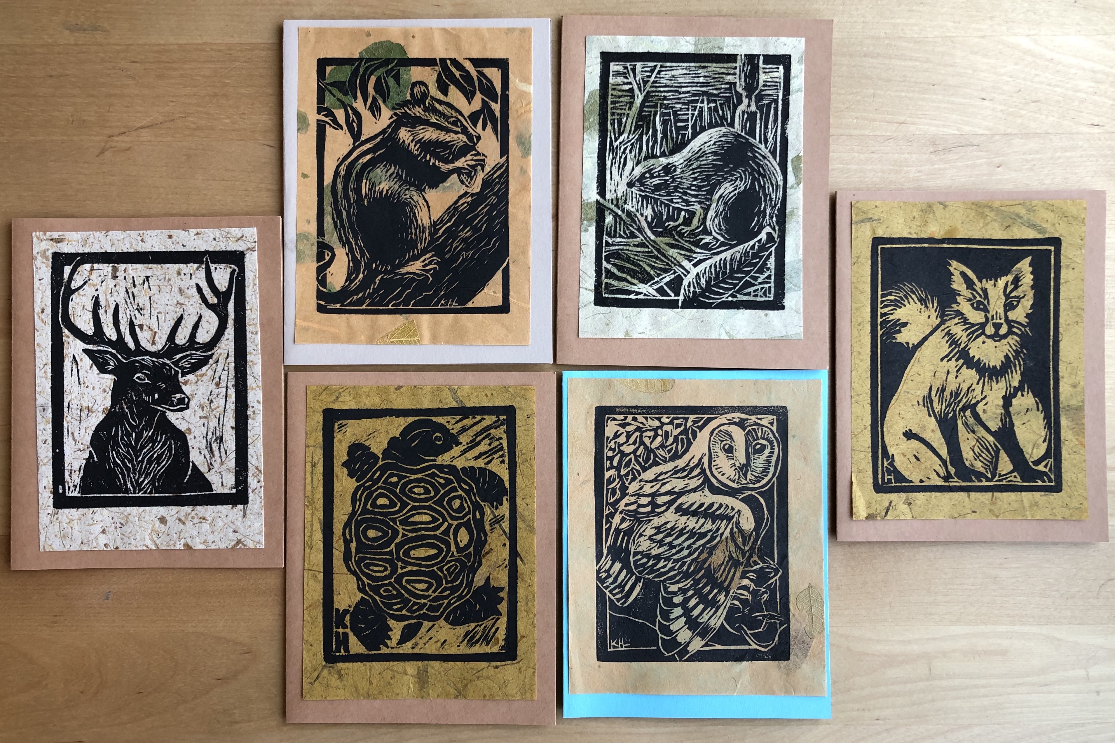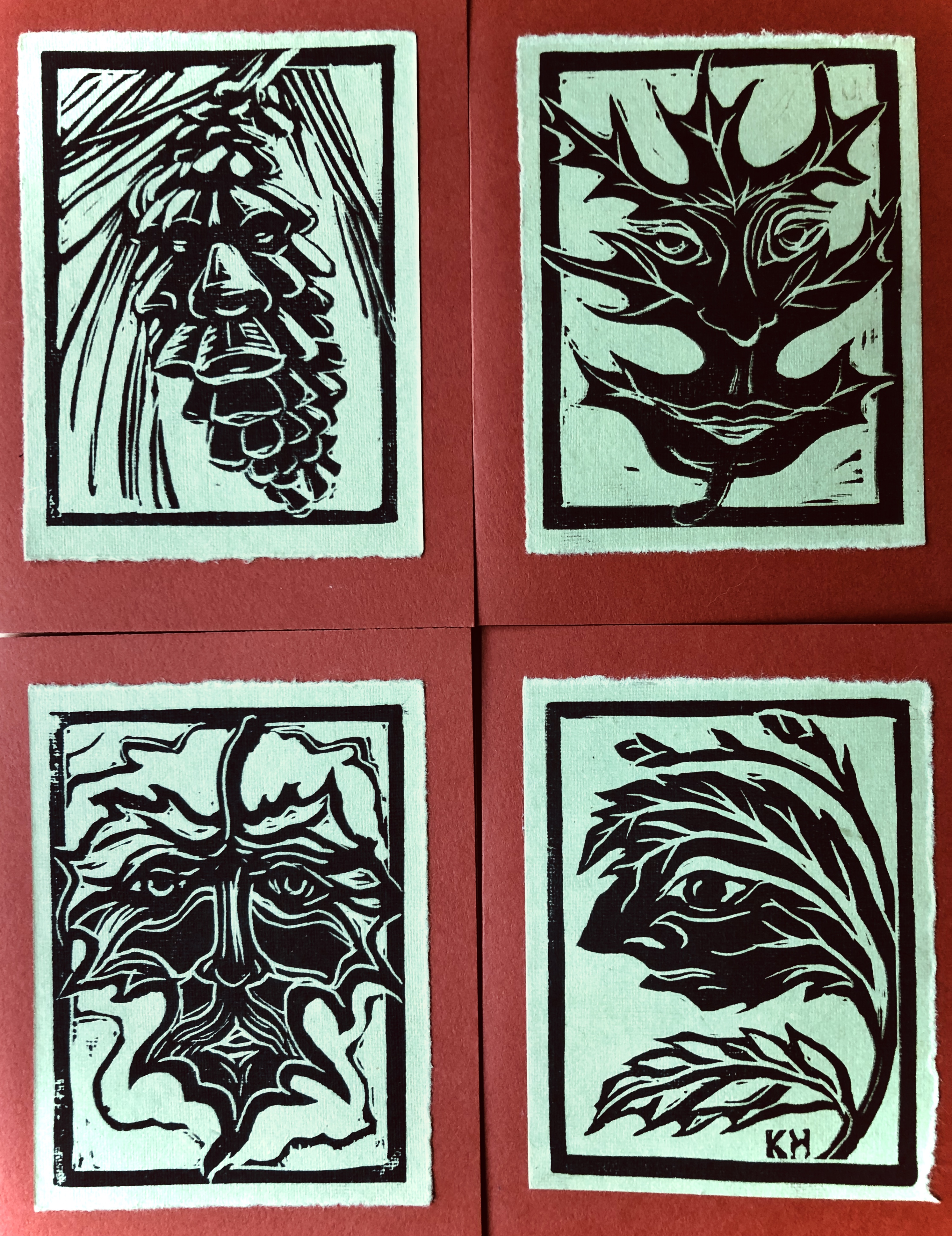 Lino-cut prints, on mulberry paper, mounted on card stock. Suitable for mailing or framing.